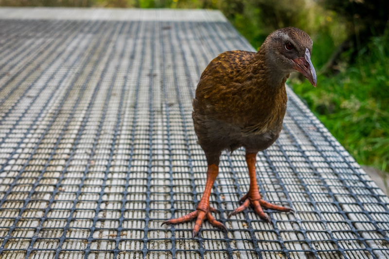 The hut’s all booked for the night because a volunteer crew there to improve a few sketchy berms, so we set up camp outside on a platform. A weka, one of the island’s craftier flightless birds, snatches my toiletries pouch in its beak and scurries under a bush.