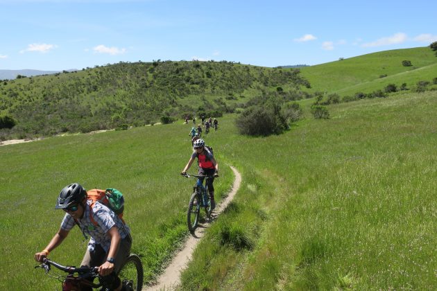Guided by Liv Ladies AllRide coaches Meredith and Tina, riders were instructed before changes in trail conditions on how to handle obstacles and terrain, as well as general advice on body positioning, speed and braking. I leapfrogged to take advantage of photo opportunities of riders climbing or descending along switchbacks in a long line like a pilgrimage, enjoy the smiles and looks of excitement (and occasional terror) on riders’ faces as they passed me, and of course the famous Central Coast wildflowers that decorate the Fort Ord National Monument.